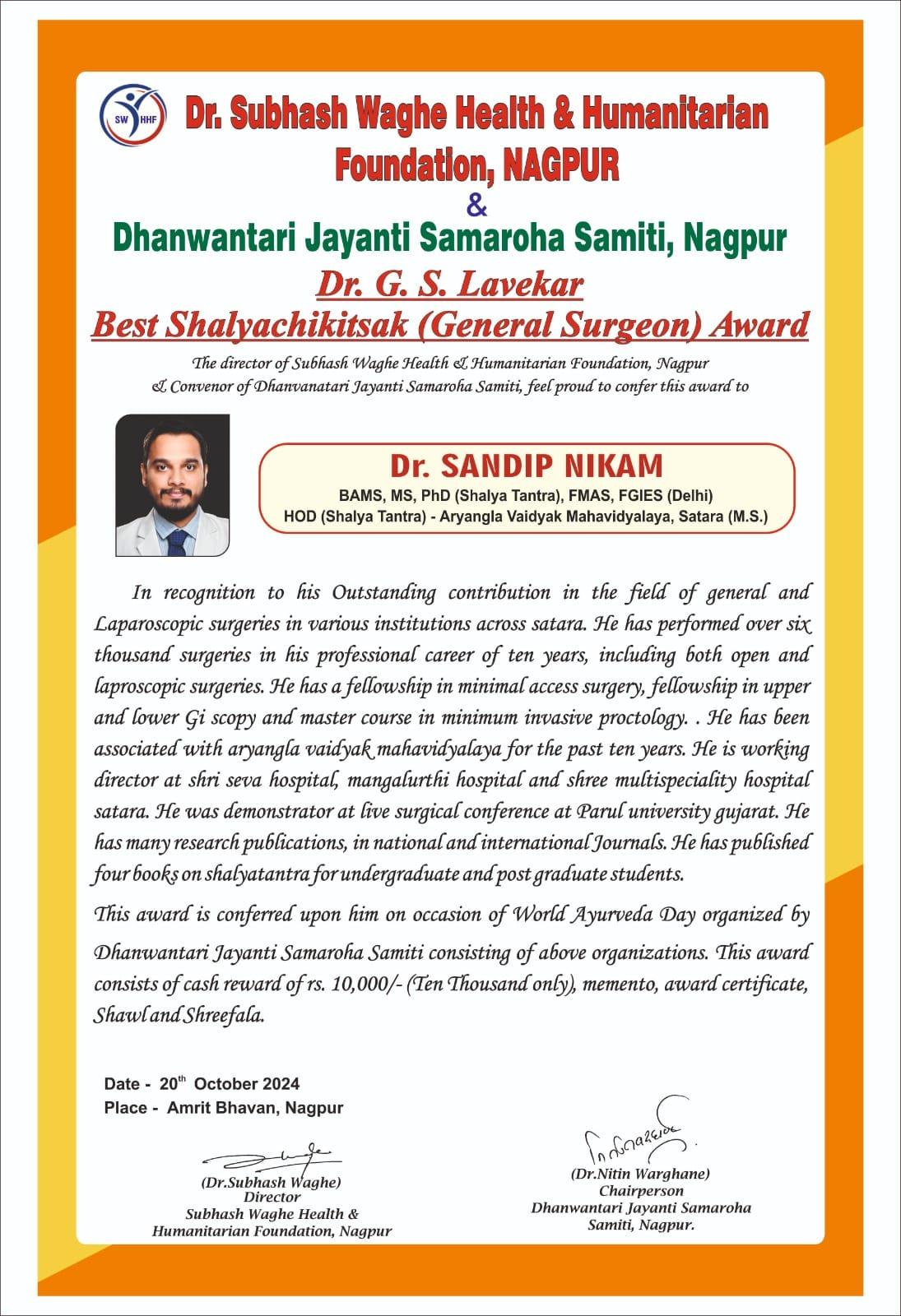 | 1 | 2024, Amrit Bhavan Nagpur | Dr. Subhash Waghe Foundation | Dr. G. S. Lavekar - Best Shalyachkitsak Award | Dr. Sandip Nikam (Satara) |  |  |  |