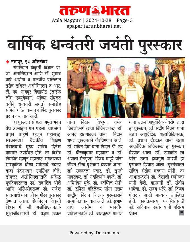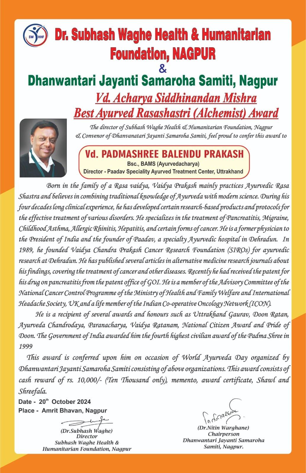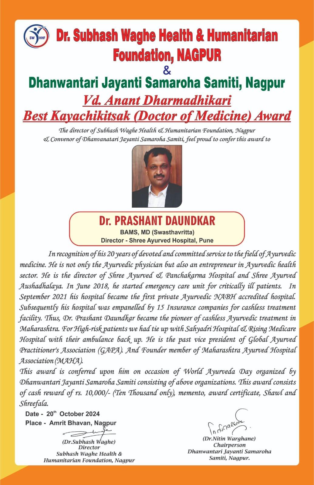 | 3 | 2024, Amrit Bhavan Nagpur | Dr. Subhash Waghe Foundation | Vd. Anant Dharmadhikari - Best Kayachikitsak Award | Dr. Prashant Daundkar (Pune) |  |  |  |