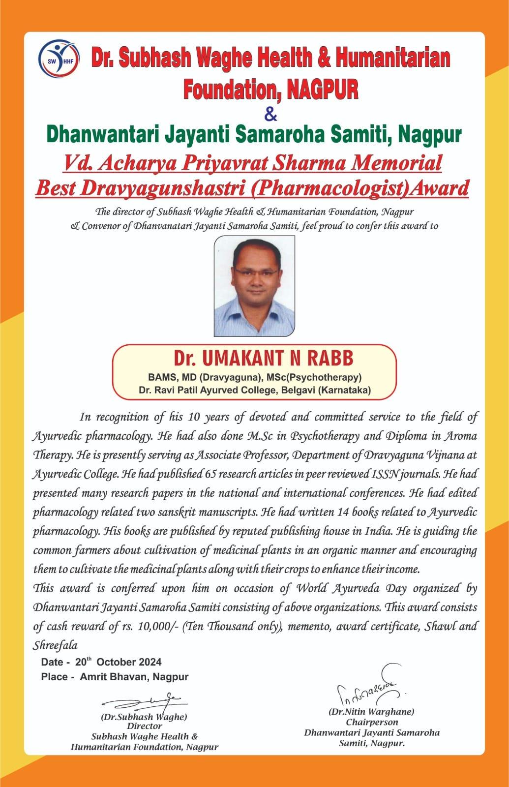 | 4 | 2024, Amrit Bhavan Nagpur | Dr. Subhash Waghe Foundation | Vd. Priyavrat Sharma Memorial - Best Dravyaguna-shastri Award | Dr. Umakant Rabb (Belgavi) |  |  |  |